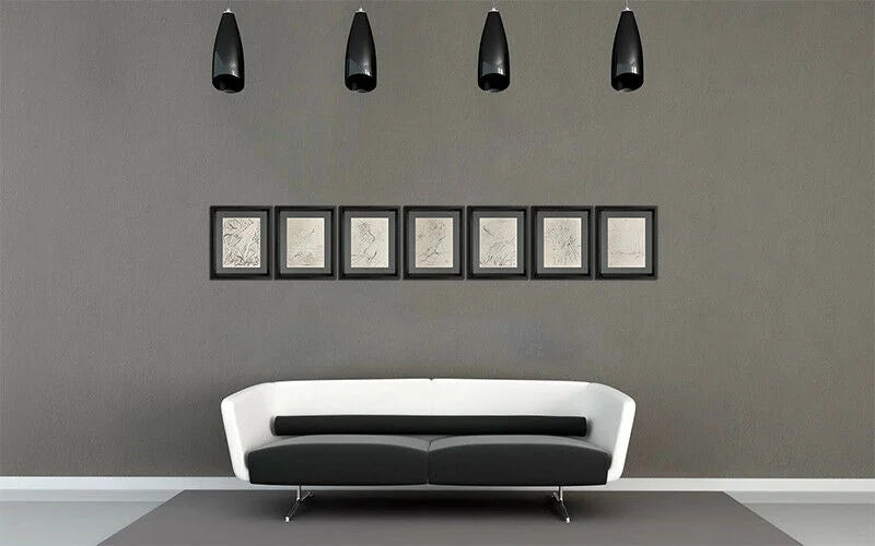 All 7 are Custom Gallery Framed using a solid Wood Frame, UV blocking resistant glazing for preservation of the art, the finest quality Matte (Crescent Matte), acid free mat and acid free backing. Materials are: UV blocking glazing, Linen acid free matte, all wood Moulding with a modern black finish. All our framing is Custom and Professional using only archival materials for the preservation and protection of all our artwork. Extra care will be taken to assure a safe delivery as the framing cost was over $1533 for these artworks.
