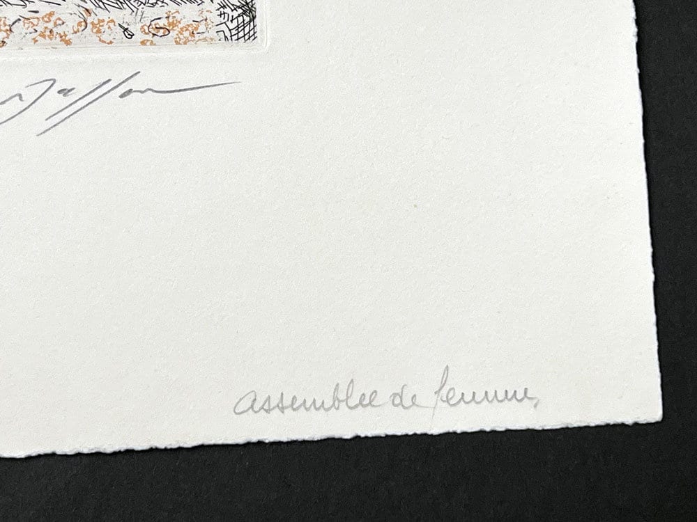 Very Rare Original Masson Etching with deckled edges. Titled: Assemblée de femme. 1966. Size : 34,9 x 31cm (Frame: 19 3/4 x 18 1/4in. Numbered Limited Edition 29/50. Hand Signed and numbered by Masson in pencil. Artwork comes with Gallery Prepared Documentation, which includes Authentication Certificate + Provenance.