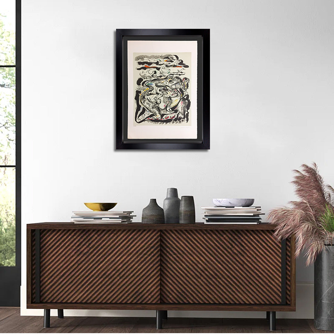 Professional custom cut and sized frame. Material used: Solid wood moulding, Crescent™ Acid Fee Museum Rag Mat™ + acid free backing and TruVu™ UV Protection Anti Glare Museum™ Glass. Modern Now's in-house framer constructs all of the archival framing to match the same specification of the artworks that are hung in the gallery for the preservation and protection of your artworks.
