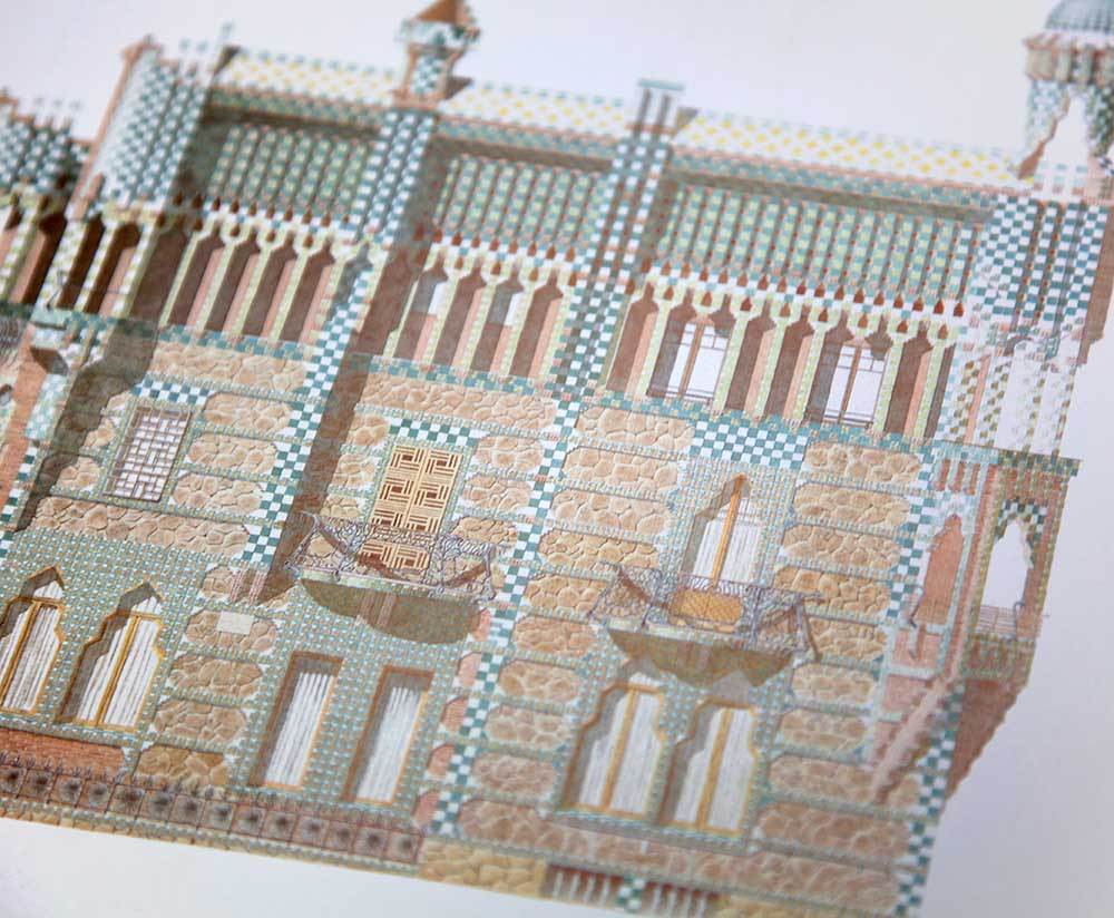 Antoni Gaudí Limited Edition Lithograph. Lithograph in Color. Size: 29.8x41.9cm. Titled: Lámina I : Casa Vicens, facana carrer Carolines (Casa Vicens, Caroline Street Facade). Frame Size: 20x24.5in. Gallery Exhibited in 2011. Impressió: Tallers Grafics Hostench, S.A. Barcelona de l'E.T.S. d'Arquitetura de Barcelona 1985. Gallery Prepared Authentication and Provenance included with artwork.