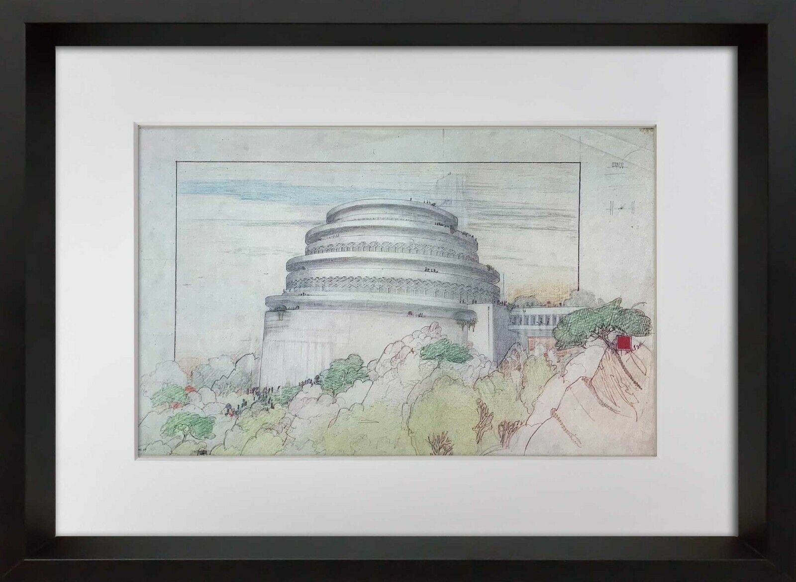 Limited Edition Frank Lloyd Wright Lithograph. Project: Gordon Strong Automobile Objective and Planetarium, Sugar Loaf Mountain, Maryland, 1923. Size : 39.5 x 25.5cm. Frame Size: 25 1/2 x 20in. The red square with Frank Lloyd Wright in block letters is a registered trademark belonging to the Frank Lloyd Wright Foundation. It is a numbered Limited Edition and this one being no. 205 which has justification Authentication of which a copy is included. Licensed Limited Edition by the Frank Lloyd Wright Foundation, 1962. Artwork comes with Gallery Prepared Documentation, which includes Authentication Certificate + Provenance Plus a Numbered justification copy included with artwork.