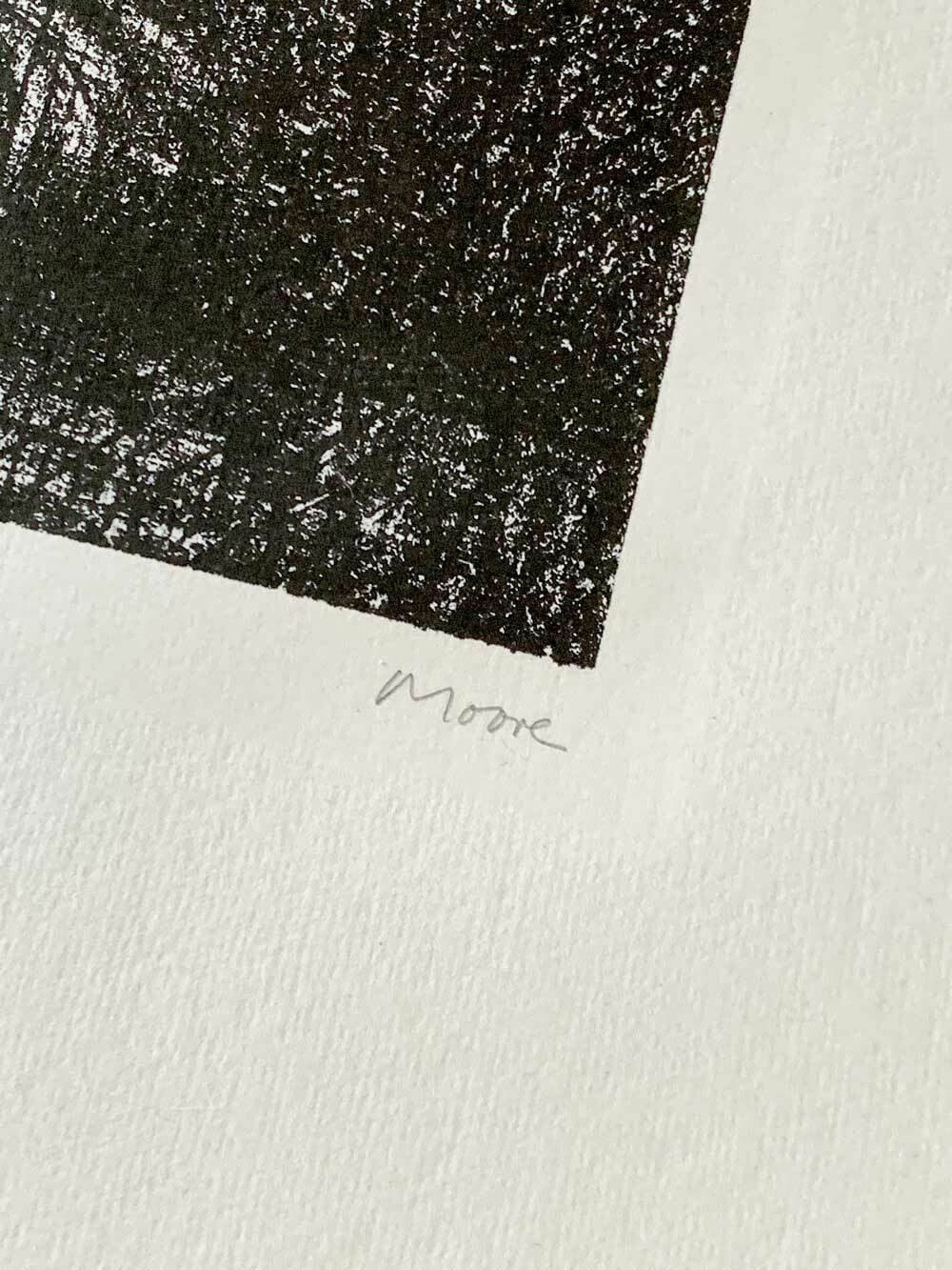 For many years Moore had owned a drawing by the French pointillist artist Seurat. Seurat created his images from tiny dots that visually gave no outline to an object thus fusing the object into its surroundings. Moore used this technique, describing it as an entirely new way of drawing, using no outlines and fusing together space and form, light, depths and distances into a marvellous and mysterious unity of vision. There was never any question of introducing colour. Moore was always after a printed image identical to the blackness of the drawing, which described something of the bleak industrial landscape and the rugged high moors of Yorkshire.