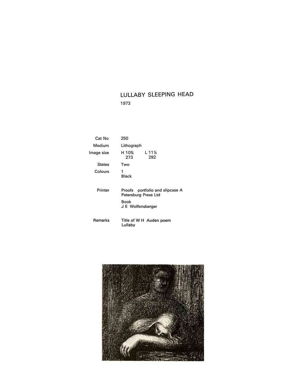 Original Hand Signed Limited Edition Henry Moore lithograph, 1973. Title: Lullaby Sleeping Head. Original Stone Lithograph. Proofed at Petersburg Press, Ltd London 1974. On Handmade Hodgkinson paper that is watermarked (crop mark designed by Moore) with deckled edges. Hand Signed (lower right) and hand numbered (lower left). This is of a limited edition of 75, this one being no. 65. This piece is catalogue referenced by Cramer (c250) of which reference is included with artwork. Artwork comes with Gallery Prepared Documentation, which includes Gallery Certificate of Authenticity and Prepared Catalogue Reference (c250), justification copy and Provenance. This is the VERY LARGE PAPER size lithograph (51,4 cm x 64,2cm), from the XL Edition out of 75. Frame: 26 1/4 x 31 1/4in.