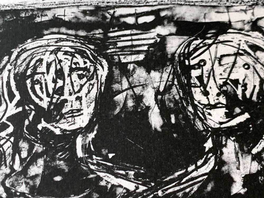 For many years Moore had owned a drawing by the French pointillist artist Seurat. Seurat created his images from tiny dots that visually gave no outline to an object thus fusing the object into its surroundings. Moore used this technique, describing it as an entirely new way of drawing, using no outlines and fusing together space and form, light, depths and distances into a marvellous and mysterious unity of vision. There was never any question of introducing colour. Moore was always after a printed image identical to the blackness of the drawing, which described something of the bleak industrial landscape and the rugged high moors of Yorkshire.