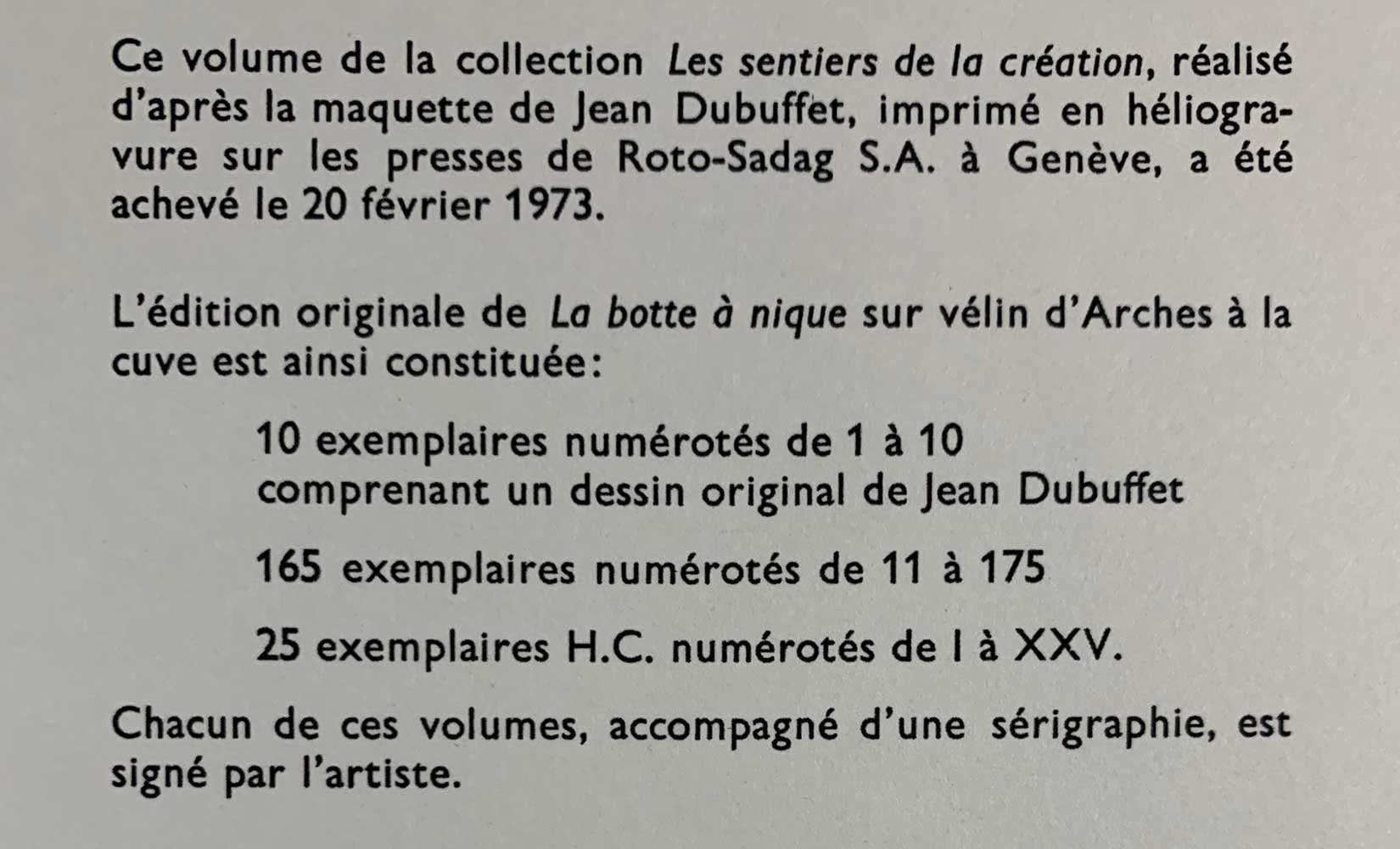 Limited Edition JEAN Dubuffet Lithograph. Size: 16.4 x 21.4cm. Frame Size: 16 1/2 x 18 1/2in. This is a Limited Edition one of Dubuffet's vacuum forms. A collection of Les Sentieres de la creation, sur les presses de Roto-Sadag S.A. a Geneve 1973 on Velin Maroquin paper. Separate color authentication paperwork prepared and included: Gallery Certificate of Authenticity + Provenance + Numbered Limited Edition Justification included plus its Custom Archival and Gallery Quality Framed. Custom Framed using a solid Wood Frame, UV blocking resistant glazing for preservation of the art, the finest quality Textured Acid Free Matte (Crescent Matte), and acid free backing. Materials are: UV blocking glazing, Acid free Museum Grade Rag Mat, all wood Moulding. All our framing is Custom and Professional using only archival materials for the preservation and protection of all our artwork. Please note: Custom frame is selected upon purchase and is subject to change and our designer is happy to work with you to select a frame to match your aesthetic needs.
