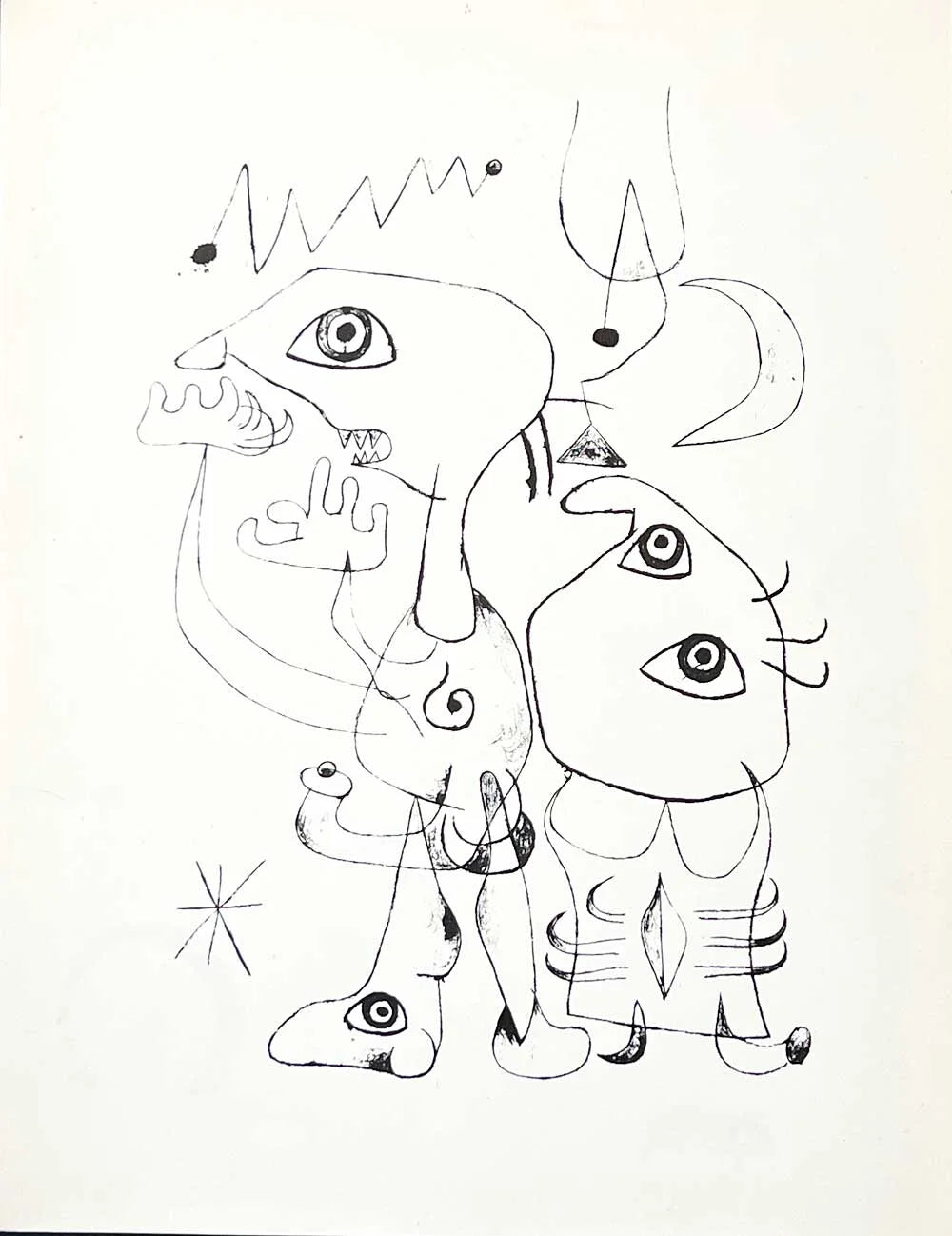 Joan Miro Limited Edition lithograph, 1947. 21,5x27cm. Frame: 14x16in. From the presses of Golden Eagle Press and Martha Berrien Atelier 17, New York. Separate color authentication paperwork prepared and included: Certificate of Authenticity + Provenance and Catalogue References included with Artwork: c13 (see reference and justification images) Artwork comes with Gallery Prepared Documentation, which includes Authentication Certificate and Prepared Color Catalogue Reference, which shows its authenticity (c13)& Provenance. Professional custom cut and sized frame. Material used: Solid wood moulding, Crescent™ Acid Fee Museum Rag Mat™ + acid free backing and TruVu™ UV Protection Anti Glare Museum™ Glass. Modern Now's in-house framer constructs all of the archival framing to match the same specification of the artworks that are hung in the gallery for the preservation and protection of your artworks. Please note: Custom frame is selected upon purchase and is subject to change and our designer is happy to work with you to select a frame to match your aesthetic needs.