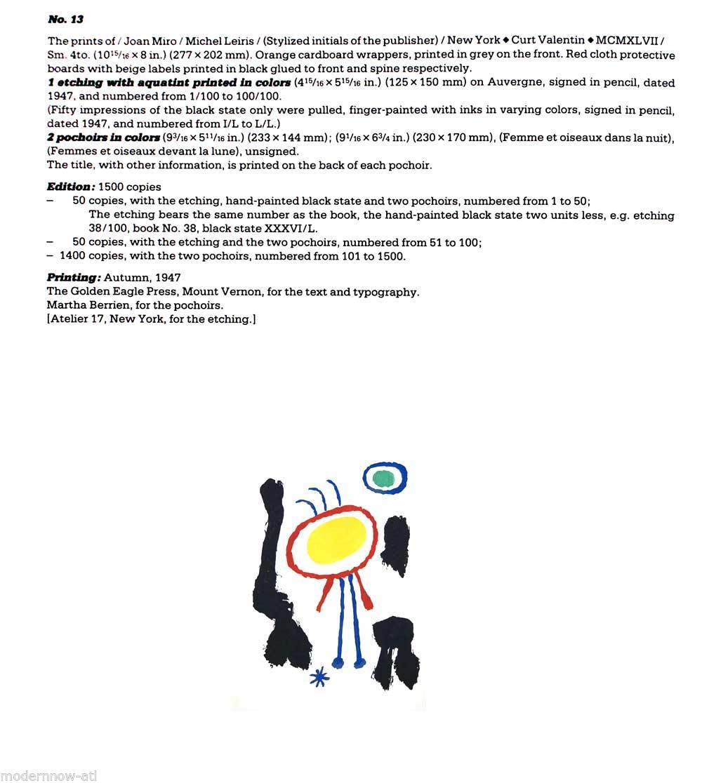 Miro Limited Edition lithograph, 1947. 21,5x27cm. From the presses of Golden Eagle Press and Martha Berrien Atelier 17, New York. Separate color authentication paperwork prepared and included: Certificate of Authenticity + Provenance and Catalogue References included with Artwork: c13 (see reference and justification images) Artwork comes with Gallery Prepared Documentation, which includes Authentication Certificate and Prepared Color Catalogue Reference, which shows its authenticity (c13)& Provenance.