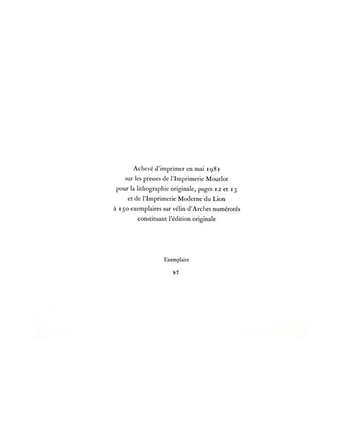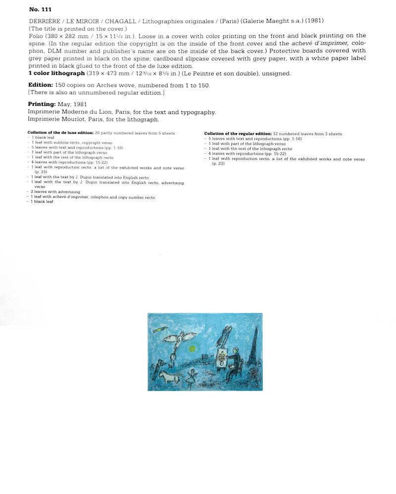Marc Chagall Color lithograph. Size: 38,1x55,8cm. "The painter and his double" Sur les presses de l'Imprimerie Mourlot, 1981. It is from a Numbered Limited Edition out of 150, this one being no. 82.. This is a Double page Lithograph on Vélin d'Arches with Deckled edges. This lithograph is accompanied by separate color authentication paperwork including Gallery Certificate of Authenticity and Provenance and Cramer reference. Professional custom cut and sized frame. Material used: Solid wood moulding, Crescent™ Acid Fee Museum Rag Mat™ + acid free backing and TruVu™ UV Protection Anti Glare Museum™ Glass. Modern Now's in-house framer constructs all of the archival framing to match the same specification of the artworks that are hung in the gallery for the preservation and protection of your artworks. Please note: Custom frame is selected upon purchase and is subject to change and our designer is happy to work with you to select a frame to match your aesthetic needs.