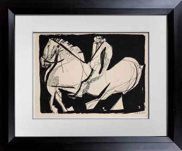 Marino Marini Limited Edition Lithograph. Size : 40.4 x 50.8 cm. Titled: Scenario (Scenery). Sur les presses de Dietz Workshop, Germany 1968. Of a Limited Edition out of 500, this one being no. 54 and on heavy woven paper. Signed in the matrix (Marino). Printing plates were cancelled, this is the special edition for the United States, Canada, Australia, Great Britain (text from justification). Artwork comes with Gallery Prepared Documentation, which includes Authentication Certificate, Provenance + copy of numbered justification. Marini is particularly famous for his series of stylised equestrian statues, which feature a man with outstretched arms on a horse. The evolution of the horse and rider as a subject in Marini's works reflects the artist's response to the changing context of the modern world. This theme appeared in his work in 1936. At first the proportions of horse and rider are slender and both are "poised, formal, and calm." By the next year the horse is depicted rearing and the rider gesturing. By 1940 the forms are simpler and more archaic in spirit; the proportions squatter... Professional custom cut and sized frame. Material used: Solid wood moulding, Crescent™ Acid Fee Museum Rag Mat™ + acid free backing and TruVu™ UV Protection Anti Glare Museum™ Glass. Modern Now's in-house framer constructs all of the archival framing to match the same specification of the artworks that are hung in the gallery for the preservation and protection of your artworks.