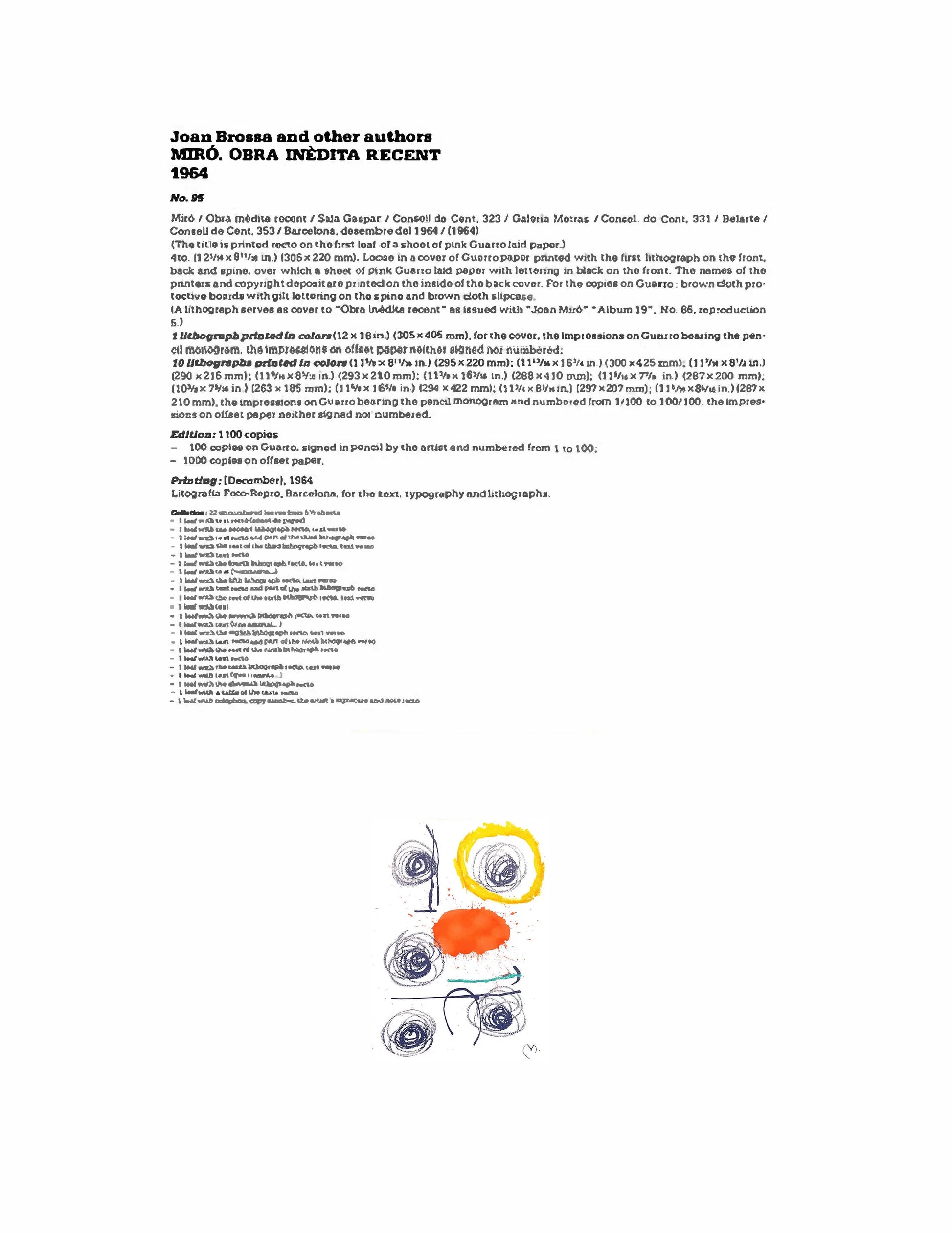 Original Joan Miro Lithograph in Color, 1964. Limited Edition Artwork. Created and Hand signed by the artist, initial, lower right. It's impressed on Watermarked Guaro paper; de les presses Litografia Foto-Repro, Barcelona December 1964 Artwork is accompanied with Gallery prepared documentation, which includes; Certificate of Authentication, Catalogue References c95. Authenticated and all documentation is included.