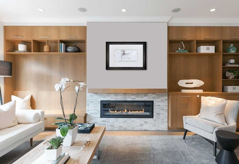 Professional custom cut and sized frame. Material used: Solid wood moulding, Crescent™ Acid Fee Museum Rag Mat™ + acid free backing and TruVu™ UV Protection Anti Glare Museum™ Glass. Modern Now's in-house framer constructs all of the archival framing to match the same specification of the artworks that are hung in the gallery for the preservation and protection of your artworks.